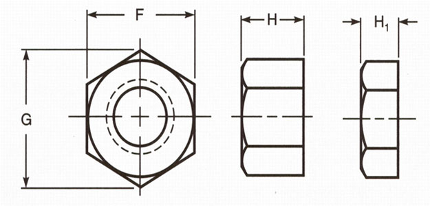 | Nominal Size | Basic Major Diameter of Thread | Width Across Flats, F | Width Across Corners, G | Thickness Flat Nuts, H | Bearing Surface Runout to Thread Axis, FLM | |||||